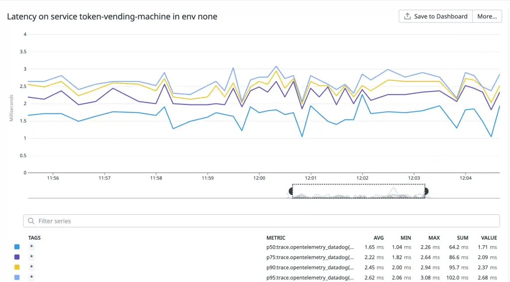 High level tracing is great and something that I love about using Datadog, but since I took advantage of the Instrument trait further up, let’s have a look at exactly how the Momento Auth operations play into the overall function latency.