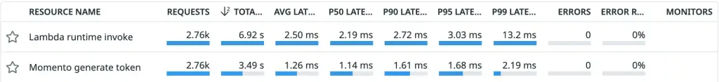 This table shows the two spans that are included in the overall latency of the Lambda Functions execution. If you remember from the code well above, I called the Momento Auth span Momento generate token. I’m happy all day long with an average latency of 1.25ms and a tail p99 latency of 2.19ms. I can’t recommend their Rust SDK enough. It is my first and preferred way to work with Momento.