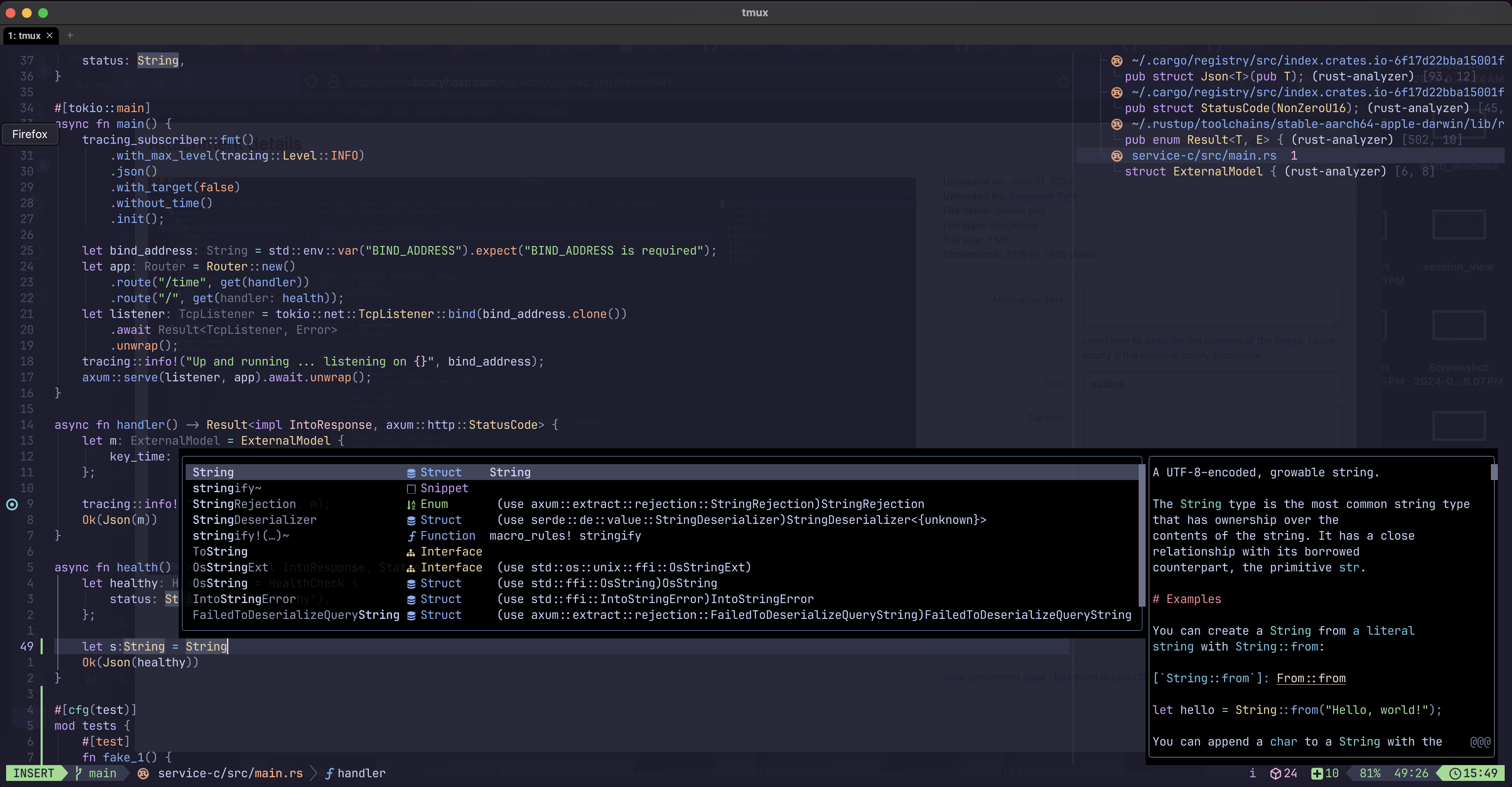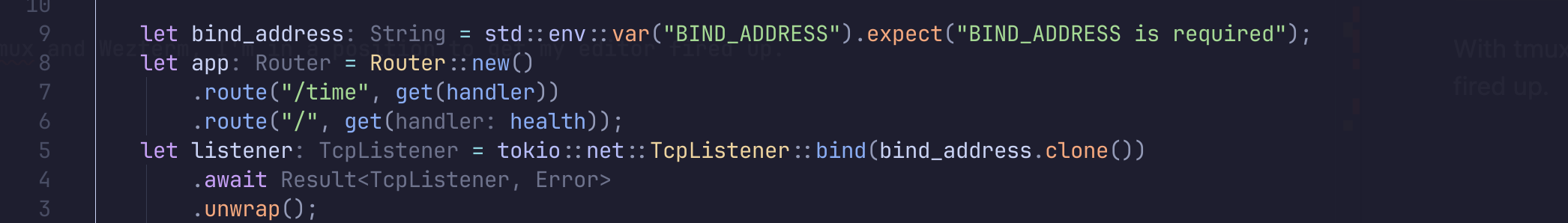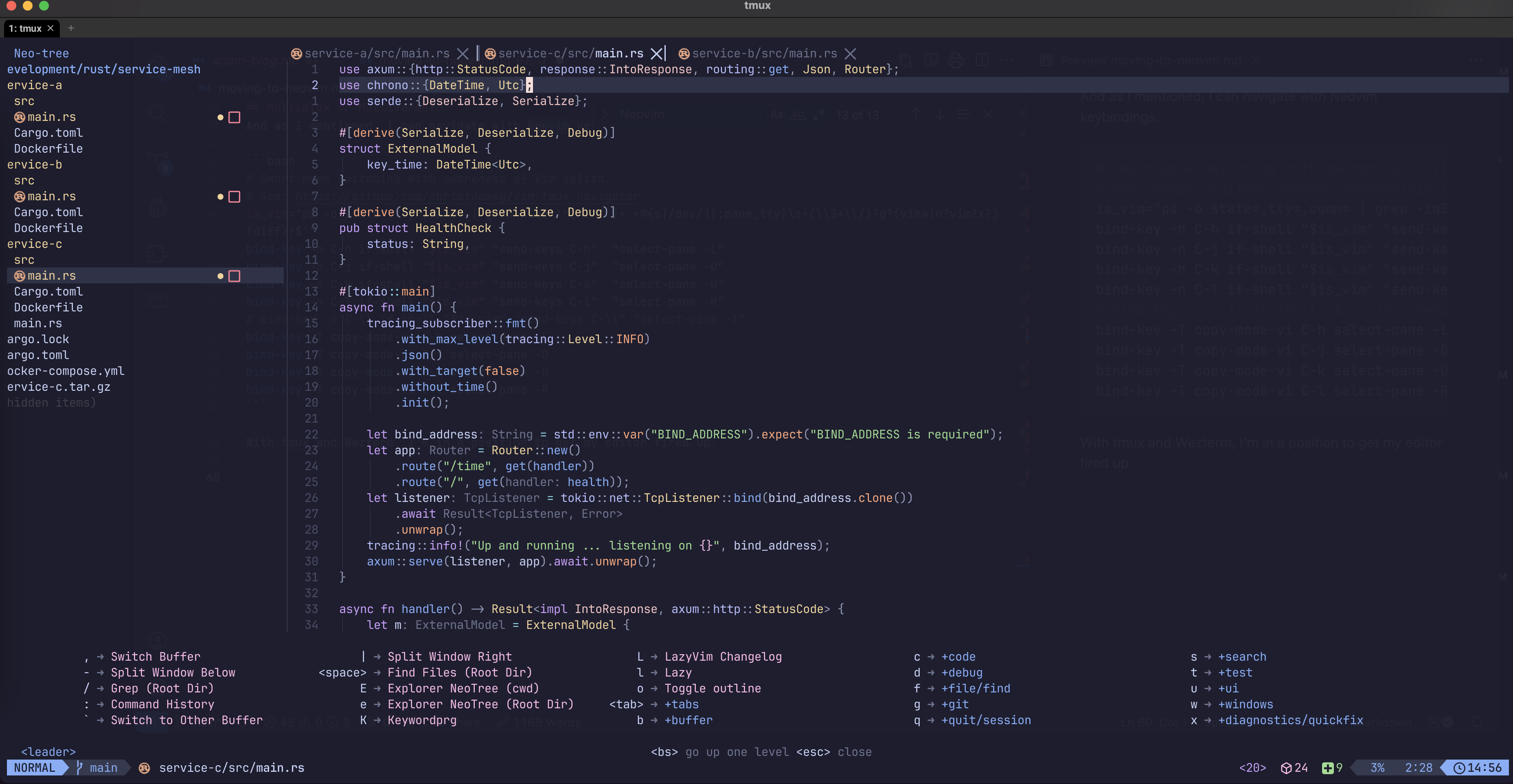 With tmux and Wezterm, I’m in a position to get my editor fired up.