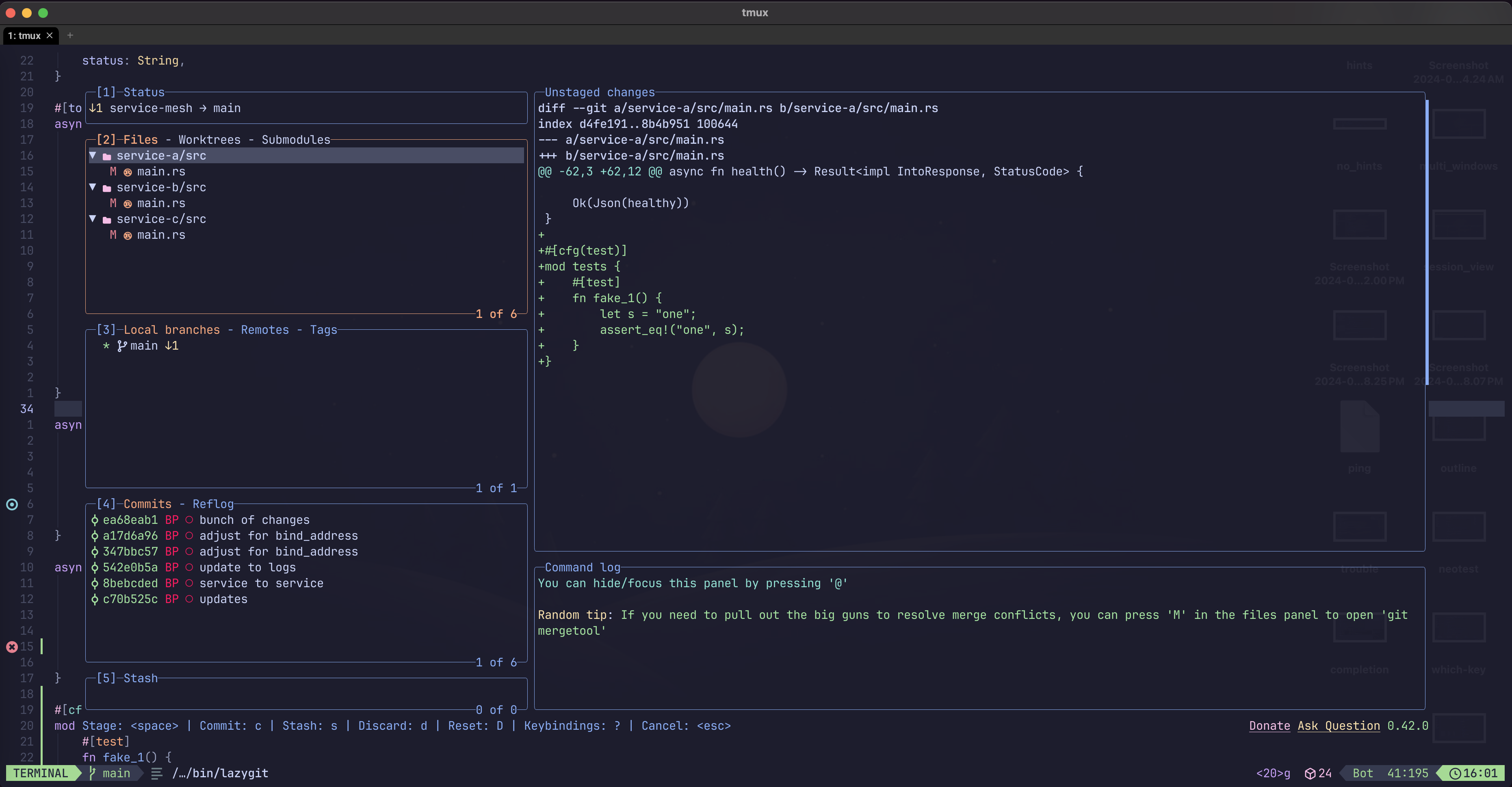 Using tmux, I could just have a shell to pivot into when I want to work with Git. Fine, and I could do that. But I’m using the Neovim plugin for LazyGit. Which takes advantage of this LazyGit UI.
