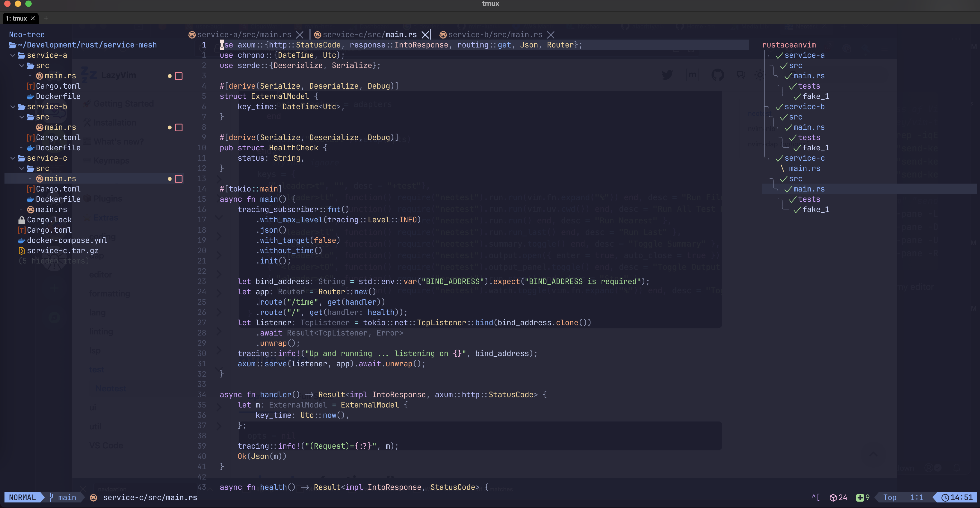 - Simplification of my tooling. I need a Terminal Emulator and Neovim. With that setup, I can work on Rust, Go, TypeScript, HTML, YAML, and any language or markup that I encounter in my day-to-day job. No VSCode for this and Jetbrains for that. No switching between keybindings and the mouse. Now, I do have many plugins that enhance my Neovim experience, but at its core, my setup is 2 things.