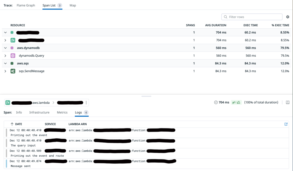 As you can see the top level Span is the execution of the Lambda itself. Then inside that span, I’ve got a call to DynamoDB and then a call to SQS to put an event on the queue. Also note the percentage of time each span took of the whole and then the duration that each represents. Here it is again when viewed vertically as a list