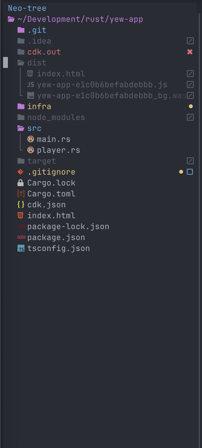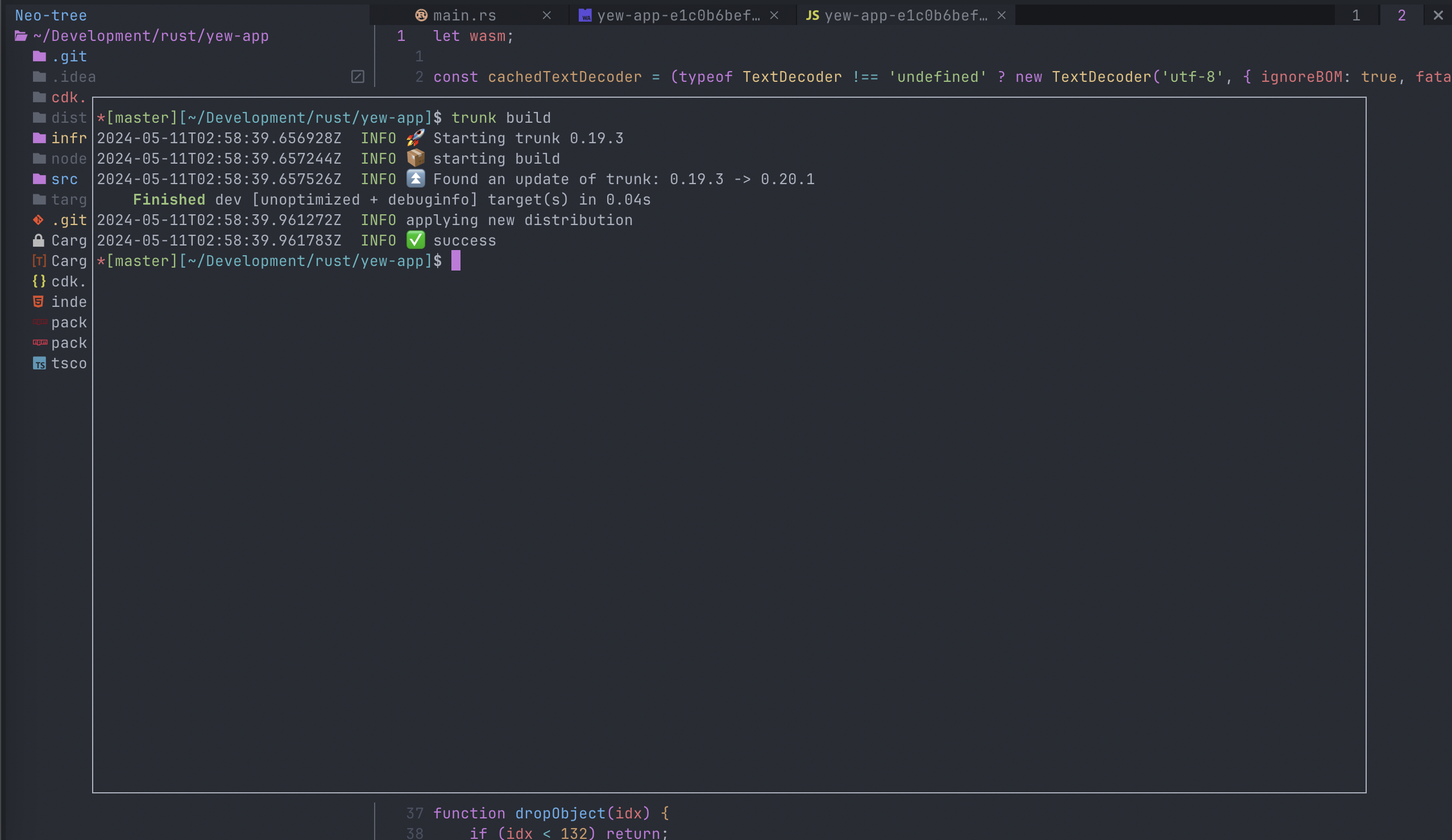 Going back to building the WASM package, I used a tool called Trunk to build and bundle the Rust code. When I run the command trunk build I’m presented with the following images. The first is what the build looks like from the console and the second is the contents of the dist directory that is created and populated.