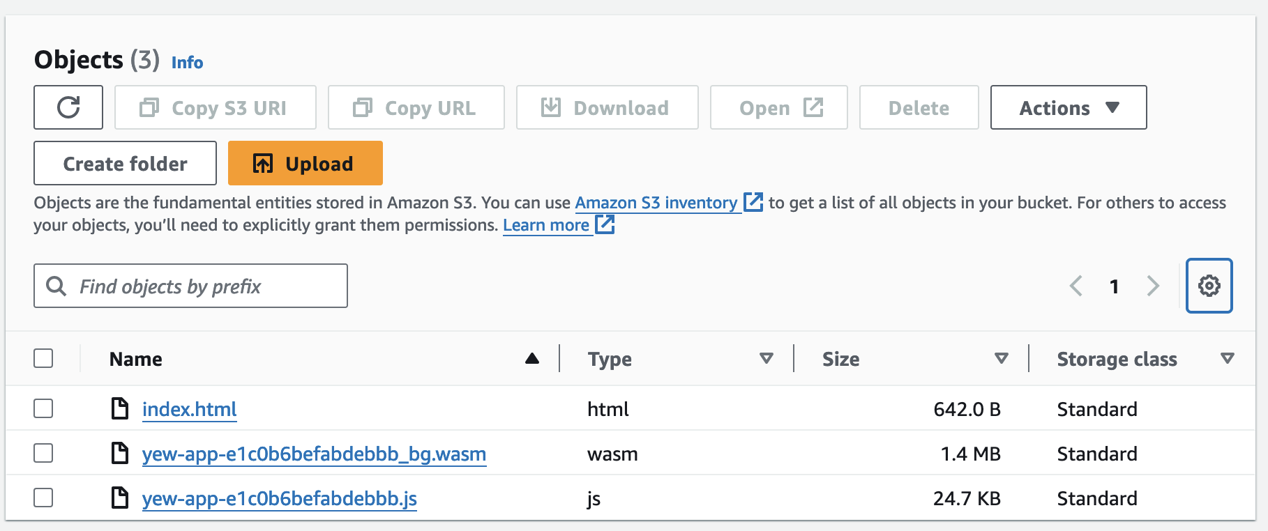 The S3 bucket will then show the HTML, JS, and WASM files.